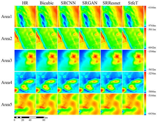 Table 1 shows the quantitative results of 638 DBMs in the test set in terms of the RMSE, MAE, and Emax indices. Among these results, those in bold highlight the best performance of each indicator, and the underlined values are the second-best results. From Table 1, we can see that, compared to other methods, STFET had the best effect on all evaluation indices. Moreover, the accuracy of all deep learning-based methods was better than bicubic interpolation, which shows that deep learning methods have an application value in DBM SR. Similar to the results for natural images [], SRGAN achieves a lower accuracy than SRResNet based on the RMSE accuracy index.