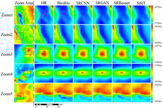 To compare the visual quality of reconstructions using different methods, we combined HR DBMs with SR DBMs generated using different methods for the corresponding regions, and these results are shown in Figure 7. We can see that, on the whole, the SR DBM reconstructed by all methods was relatively close to the HR DBM. However, in some areas with large terrain fluctuations and obvious topographic features, subtle differences in terrain could still be observed. As shown in Figure 8, we zoomed in on the area with obvious seabed terrain features in Figure 7; the reconstruction effect of bicubic interpolation and SRCNN in areas with large terrain fluctuations was too smooth, and the visual quality was poor, which is consistent with the quantitative results in Table 2. At the same time, the proposed method had a better reconstruction effect compared to other methods, and the result is closer to an HR DBM. Therefore, the results confirm the effectiveness of STFET in terms of both visual quality and reconstruction accuracy.