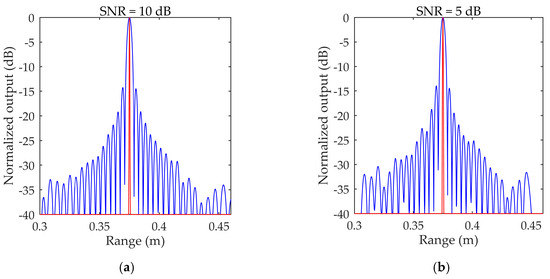 Table 2 shows that the SNR, CR, and CSR of the proposed algorithm were 24.7, 1.88, and 25.8, respectively, which were improved compared with the results of the conventional pulse compression method. The ratios of improvement for SNR, CR, and CSR were 32, 12.5, and 437%, respectively.