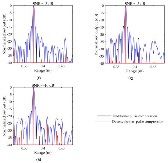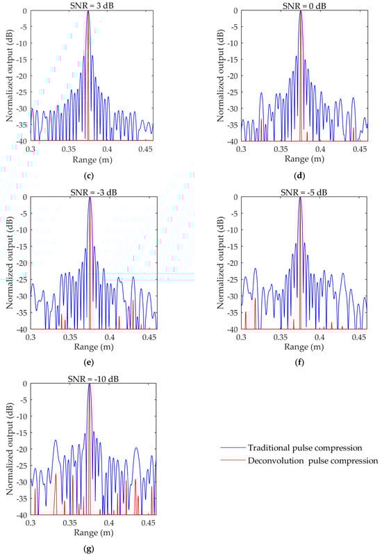 The simulation results of pulse compression and deconvolutional pulse compression under different SNRs: (a) simulation results under 10 dB; (b) simulation results under 5 dB; (c) simulation results under 3 dB; (d) simulation results under 0 dB; (e) simulation results under −3 dB; (f) simulation results under −5 dB; and (g) simulation results under −10 dB.