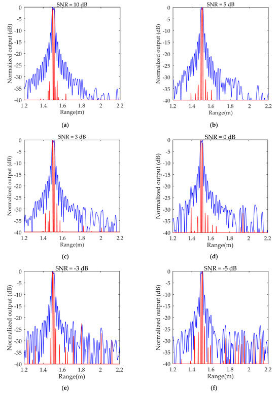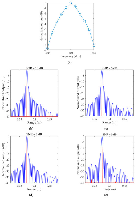 The performance under different SNRs was calculated by simulation. The simulation conditions of this section were set as follows: the transmitted signal was a LFM signal, the center frequency and signal bandwidth were 500 and 50 kHz, respectively, and the pulse width length of the signal was 3.2 ms.