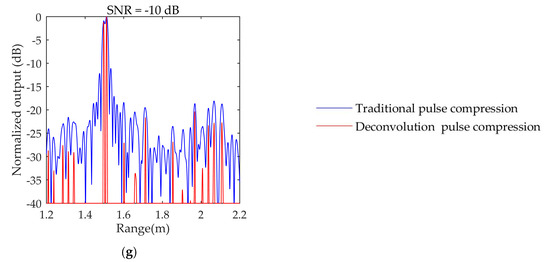 Comparison of deconvolution results with conventional pulse compression under the influence of strong interference: (a) simulation results under 10 dB; (b) simulation results under 5 dB; (c) simulation results under 3 dB; (d) simulation results under 0 dB; (e) simulation results under −3 dB; (f) simulation results under −5 dB; and (g) simulation results under −10 dB.