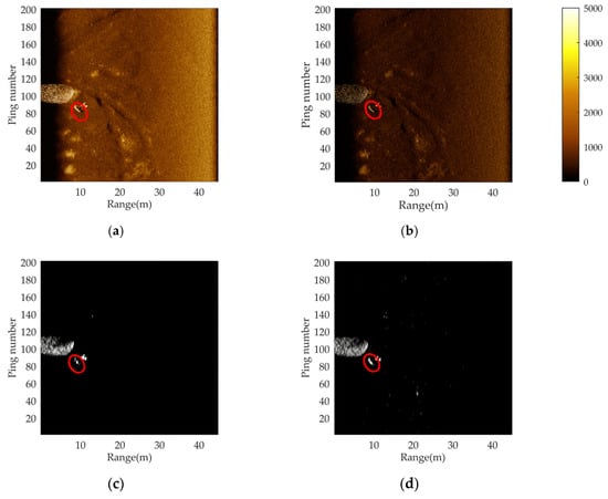 A comparison of processing results between the conventional pulse compression technique and proposed method: (a) imaging results of conventional pulse compression technology; (b) imaging results of the proposed method; (c) image segmentation results after imaging by conventional pulse compression technology; and (d) image segmentation results after imaging by the proposed method. The red ovals represent the small target area.