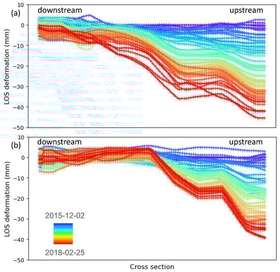 Indicative across-TSF temporal plot of InSAR Line-Of-Sight (LOS) deformation: (a) NTSF slump area and (b) stable south TSF. Downstream indicates the location of the dam toe, and upstream indicates the direction towards the deposited tailings.