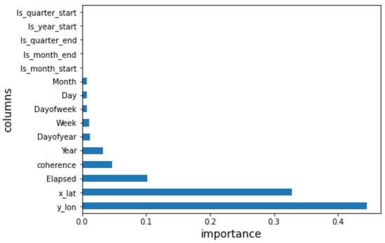 The redundancy and importance of each of these InSAR metadata features were evaluated using a simple RF model. Figure 3 plots the relative importance of each of the features predicting deformation using all data points on the full temporal domain. For example, the top-three variables were the location of the measurement as described by the latitude (“x_lat”), longitude (“x_lon”), and the “elapsed” variable, which summarises each date as the number of days elapsed since 1970. The RF hyper-parameters are specified in Table 1. The most-important features were then used as guidance for choosing the variables to be taken forward into the EE-DL approach: latitude, longitude, elapsed, coherence, year, month, and day. The performance of the various approaches was evaluated using the Root-Mean-Squared Error (RMSE), which is described by Equation (1), where and are the measured and predicted deformations, respectively, for variable i, where N is the number of measurements.