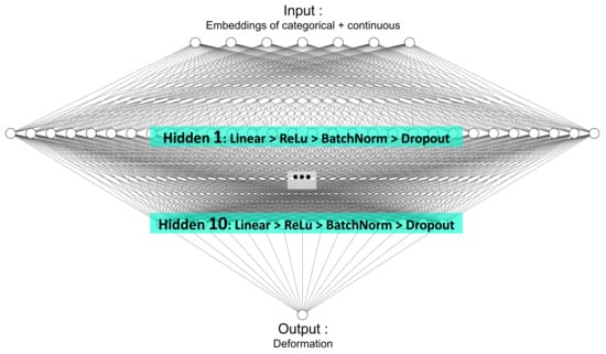 A simple, fully connected neural network performed the best with entity embeddings in the Kaggle-winning model [29]. That model outperformed more-complex approaches, including recurrent neural networks and their variants. Therefore, for simplicity, fully connected architectures were adopted for training the InSAR embeddings. Figure 4 illustrates the fully connected architecture adopted for this study. This model has ten hidden layers, with each layer made up of Linear–ReLU–Batch Norm–Dropout layers. The first hidden layer starts with 1100 neurons, and in each hidden layer, the number of neurons reduces by 100. The hidden layer structure and the neuron size ratio are similar to the fully connected architecture adopted for training embeddings in [30,31]. The output layer is a linear layer with a sigmoid activation function.
