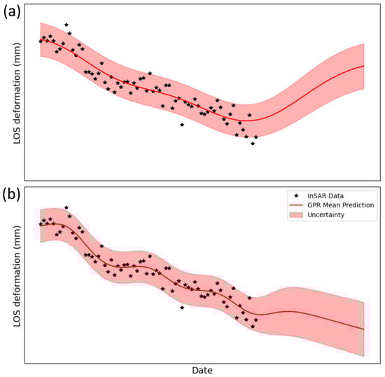 Critically, prior knowledge can be encoded through the choice of the kernels. The commonly used Radial Basis Function (RBF) kernel was adopted here and is described by Equation (2). It has a length scale parameter , which describes the smoothness of the function. This parameter controls whether the model captures the data similarity of measurements very close or far away from each other. Therefore, a large results in a smoother function. Figure 5 shows the ability of the RBF kernel in capturing the InSAR deformation. It is clear from Figure 5a that the RBF kernel on its own tends to return to zero and, therefore, does not adequately capture the expected behaviour of the InSAR deformation. This tendency to return to zero was overcome through the combination of the RBF kernel with a linear kernel, as shown in Figure 5b. GPR models are described by hyper-parameters, which influence the predictive performance. Therefore, these hyper-parameters were optimised using gradient descent methods and the likelihood function.