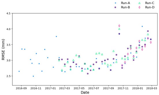 The minimum number of temporal data points required as training data for an acceptable EE-DL model performance was also explored. Figure 7 plots the global RMSE for InSAR measurements and the predictions for each inference date. The shortest number of input dates used for training was in Run-A, which had an input of 21 dates (2015-12-02 to 2016-08-10). The RMSE for Run-A was noisy for the first 13 predictions until 2017-02-06, after which the RMSE variability was significantly less in time, plateauing at approximately 3mm. This implies that a minimum of 35 dates, from 2015-12-02 to 2017-01-25, is required to obtain a stable deformation prediction. The data up to 2017-02-06 were used for training Run-B and Run-C. The longest input of 56 dates from 2015-12-02 to 2017-10-04 was for Run-D.