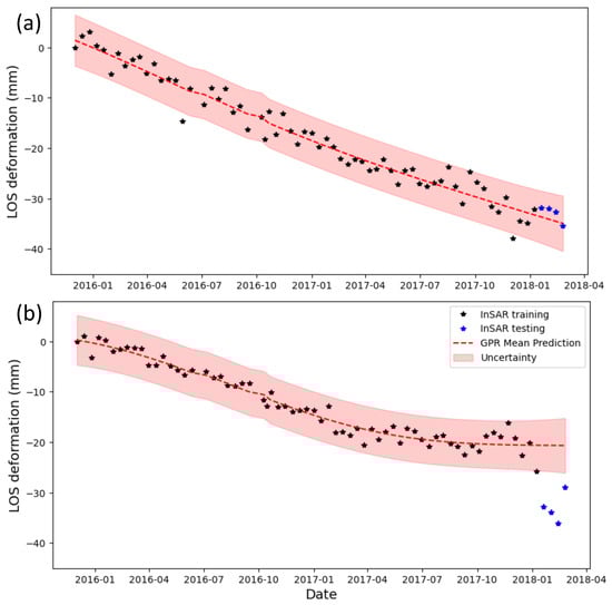 The temporal history of example InSAR measurements and GPR predictions is plotted in Figure 8. In these plots, the InSAR measurements from the last four dates were not included in the training of the model and were used as testing data. Figure 8a displays a linear, relatively simple deformation behaviour. The test measurements may be described as displaying a “normal” behaviour, because they (blue) were captured within the uncertainty envelope. A more-complex, non-linear deformation behaviour is captured in Figure 8b. In this plot, all test measurements fall significantly outside the uncertainty envelope—displaying an anomalous deformation behaviour.