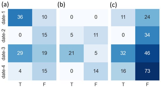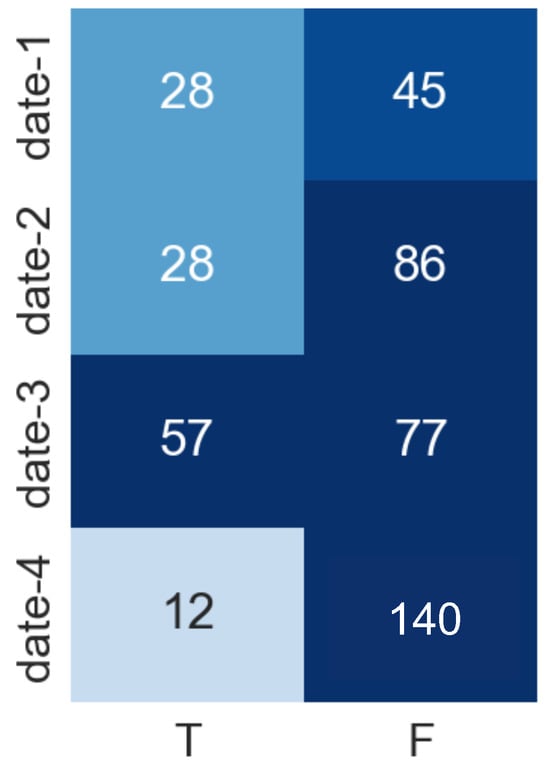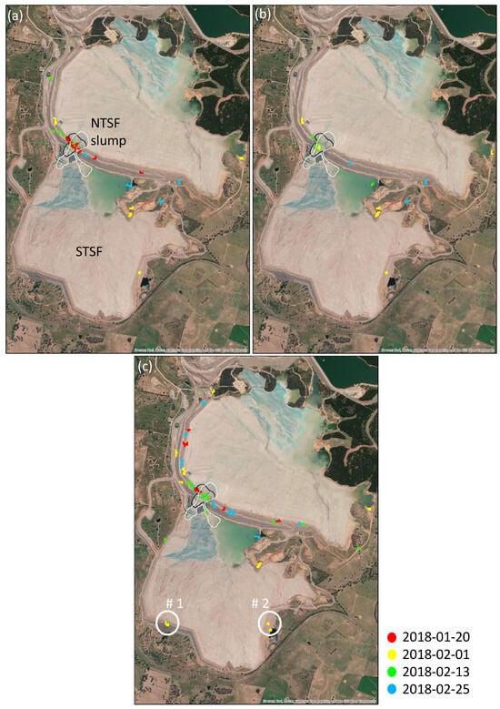 Any measurements displaying such anomalous deformation behaviour in the last four temporal points were then clustered. The number of anomalous clusters detected at each date were counted and are summarised in Figure 9. As expected, there was a significant number of anomalous clusters detected in the failure area of the TSF for all dates, also referred to as true positives in the “T” column. However, this was at the expense of a much larger number of false positives (“F” column). This large number of false positives limited the ability of using the GPR uncertainty envelope for localising the problematic parts of the TSF—the failure area.