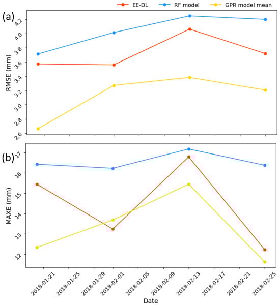 The results of the EE-DL and GPR approaches were compared to the baseline model, RF. The global error between the measured and predicted deformation at test time is plotted in Figure 10. As expected, the simplest approach, RF, performed the poorest. It has a consistently high RMSE for all test dates compared to the other models in Figure 10a. The best-performing model was GPR, which had the lowest RMSE for all the time steps. The EE-DL performance was intermediate between RF and GPR for all dates. The RMSEs were approximately up to ±4 mm and were similar to the absolute error related to the background prediction noise level in Figure 6. A value of ±4 mm is consistent with the background noise level of InSAR measurements reported in previous studies, e.g., [52,53]. Therefore, an error envelope of 8 mm was adopted as a threshold for separating normal from anomalous deformation behaviour. Similar to the RMSE results, the Maximum Error (MAXE) was also highest for RF. In Figure 10b, RF consistently has the highest MAXE for all dates. Interestingly, the shape of the MAXE was consistent for the last three dates for all the models, which gave the highest MAXE for 2018-02-13 and the lowest immediately preceding the failure in 2018-02-25.