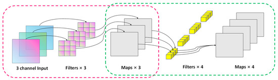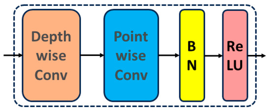 In this study, we have implemented depthwise separable convolution, an extremely efficient convolution operation that maintains superior performance [44]. Its schematic diagram is illustrated in Figure 2. Depthwise separable convolution breaks down the conventional convolution operation into depth-wise convolution and point-wise convolution. The calculation of depthwise convolution is shown in Equation (2):