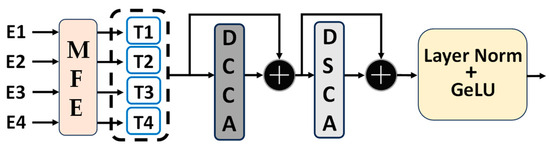 Schematic diagram of the DDCA module structure. E1, E2, E3, and E4 represent the output of the corresponding layers of the encoder. After being processed by the multiscale feature embedding module (MFE module), T1, T2, T3, and T4 are obtained. DCCA stands for depth channel cross attention mechanism module, DSCA stands for depth space cross attention mechanism module, the black plus symbol represents addition operation, and GeLU is the activation function we use, which is the abbreviation of Gaussian Error Linear Unit.