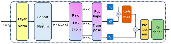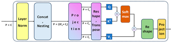 First, layer normalization is performed on all input (Represents the i-th token input, i = 1, 2, 3, 4) of size P × Ci and the list nesting operation is performed to obtain the values of , , and after being connected along the channel dimension by Concat. The size is P × (2Cc + Ci), where Cc is the cumulative result of all channel dimensions, and is used for queries.