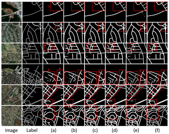 Quantitative analysis results of the six models on the DeepGlobe road dataset. For easy understanding, we mark the serial numbers with the corresponding letters in Figure 10.