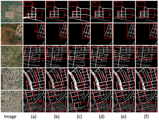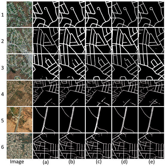 The performance results of the five schemes in the ablation experiment on the Massachusetts road dataset and the DeepGlobe road dataset. Where the image represents the original image, (a–e) represents the results of the corresponding experimental plan, 1, 2, and 3 represent images from the Massachusetts road dataset, and 4, 5, and 6 represent images from the DeepGlobe road dataset.