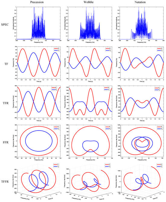 In Figure 2, we compare the modulation characteristics of typical micro-motion forms. The first to third columns represent the three forms of micro-motions: precession, wobble, and nutation. The first to fifth rows demonstrate the frequency spectra, TF, TFR, FFR, and TFFR representations of the cone-shaped target in these micro-motions.