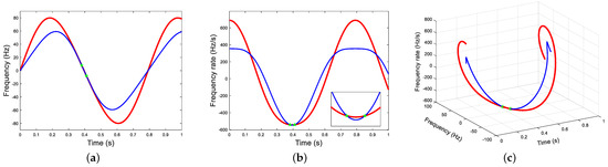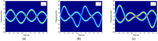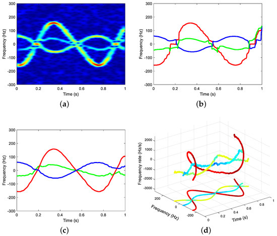 Figure 16a illustrates the STFT of the radar echo, from which we can see that three signal components of the space cone-cylinder target under wobble overlap in the TF plot. The results of the ridge extraction by VA and RPRG for these three components are shown in Figure 16b and Figure 16c, respectively. It is seen that both methods can improve the ridge curve extraction accuracy to some extent by minimizing the path penalty function and utilizing the frequency variations. However, association errors still occur at the intersections due to the frequency ambiguity of the TF representation. Figure 16d demonstrates the estimation results of the wobble components based on STSR. Benefiting from the joint estimation of the frequency and frequency rate, three signal components exhibit separated and non-crossing spatial trajectories based on the three-dimensional TFFR representation, consistent with the aforementioned theoretical derivation in Section 3.2.
