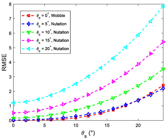 Figure 4 shows the RMSE with different coning angles varying from 5 to 20 and wobble amplitude changing from 0 to 25. It is clear that the RMSE is much lower at a slight angle, e.g., the coning angle and wobble amplitude are less than 15, which represents a finer fitting and verifies the correctness of the deduced mathematical formulas. Therefore, considering that the wobble and nutation angles are usually small in practical applications, the derived models can effectively approximate the actual TFFR modulation laws.
