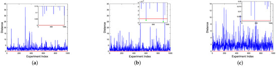 Figure 5 shows the relative relationships between the minimum distance and threshold for different micro-motion forms, where the red and blue solid lines represent the decision threshold and minimum spatial trajectory distance in the experiment, respectively. After 1000 Monte Carlo simulation experiments, it is clear that the minimum spatial trajectory distance between two scatterers exceeds the threshold in different micro-motions, with two exceptions in the wobble motion, as shown in Figure 5b (i.e., green stars). Thus, it is further inferred that the trajectories of varying scattering centers are much less likely to overlap in the three-dimensional TFFR space.