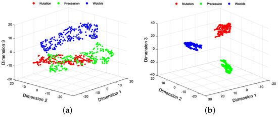 To further explore the signature separability of micro-motion signals in the TFFR space, the TFFR representation is compared with the present TF representation. We take two dominant scatterers ( and ) of a cone-shaped target as an example, which is the same model introduced before, and the micro-motion parameters and radar parameters are consistent with Table 1 and Table 2. Monte Carlo computer simulations are adopted to generate different IF and IFR sequences for three kinds of micro-motions. We regard the resulting IF and IFR sequences (i.e., spatial trajectories) as high-dimensional features of the target motion. Considering that the t-SNE algorithm is a classical non-linear dimensionality reduction technique for exploring high-dimensional data, it can capture the manifold structure of complex space [44]. Thus, we use the t-SNE algorithm to visualize the distribution of dimensionality-reduced features. Additionally, it is worth noting that t-SNE cannot preserve the global structures. Thus, the PCA algorithm is first applied to reduce the dimensionality (e.g., 50) of high-dimensional data [45].