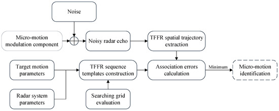 To extract the scatterer-level micro-Doppler features from intersected components, they can be transformed into multiple ridge curve detection (i.e., instantaneous frequency (IF) estimation) after obtaining the representation of the micro-motion signals [29]. The improved Viterbi algorithm (VA) obtains the IF of mono-component signals in the TF domain through dynamic programming and the path penalty function, which acquires reasonable estimates even under heavy noise [30]. However, it suffers from high computational complexity due to the search for candidate paths and cannot correctly associate the ridge curves for overlapped components at the intersection points. Given this, ridge path regrouping (RPRG) was proposed to extract intersected multi-component signals in the TF plot. Compared with the VA, the RPRG is efficient and can achieve accurate trajectory association by regrouping the detected ridge curves according to their slopes at the crossed points [31]. Nevertheless, limited by the time and frequency resolution, the detected ridges have frequency ambiguity in overlapping regions, seriously affecting subsequent ridge curve regrouping and bringing a significant error for IF estimation. In [32], the time-frequency enhancement method estimated the target’s IF based on the TF direction dictionary and directional filters, which could suppress the interference and enhance the target signal. This approach causes a computational burden owing to constructing an overcomplete dictionary and is sensitive to noise. In addition, the instantaneous frequency rate (IFR) can also be estimated on the basis of TFR representation [33,34,35]. However, as different components overlap on the TF and TFR plane, it gives rise to incorrect ridge curve association based on two-dimensional representation.
