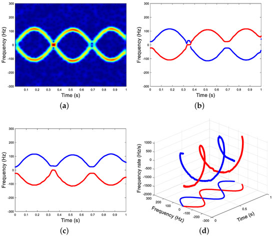 Therefore, it is seen that different trajectories of scattering centers are almost disjoint in the three-dimensional TFFR space. Joint IF and IFR characterization provide finer scatterer-level descriptions for modulations induced by micro-motion dynamics, which can reduce the complexity of component extraction and improve the representation ability of multiple components. In addition, similar to the separability of multi-component signals defined in the TF plot [43], we can obtain the spatial separability conditions in combination with the resultant distance between components in the TFFR space, denoted by for some .
