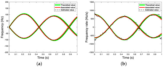 Figure 11 demonstrates one of the identification results in precession motion with SNR = 0 dB, in which the solid green line represents the theoretical value, the black dotted line is the estimated value of the IF or IFR trajectories obtained by STSR, and the solid red line is the associated value from the constructed sequence templates based on the criteria in (49) and (50). As shown in Figure 11, despite association errors between the associated value and estimated value, the associated value is similar to the theoretical value, indicating that it can still achieve a correct identification in the TFFR space.