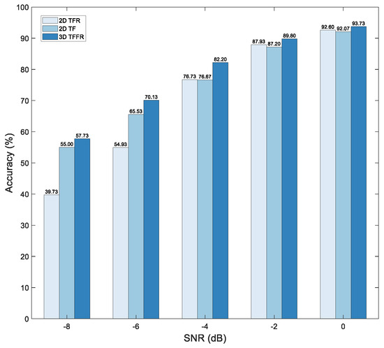 In addition, it should be pointed out that the recognition accuracy between 2D TF-STSR and 3D TFFR-STSR is close in high SNR conditions. To further explore the performance of TFFR representation, combined with the above results, we analyze the two-dimensional (i.e., TF and TFR) representations obtained by the projection of the TFFR space and three-dimensional TFFR representation in relatively low SNR conditions, where SNR varies from −8 dB to 0 dB with an interval of 2 dB.