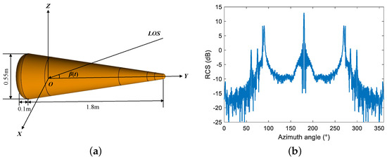 Given the practical challenges of obtaining measured data for space cone-shaped targets and the high hardware requirements for darkroom measurements, we employed electromagnetic calculation software (CADFEKO) to capture the dynamic radar echoes of micro-motion targets. This approach is characterized by its efficiency in terms of time and resources. We initially constructed the 3D geometric model of a space cone-shaped target using CADFEKO, as depicted in Figure 13a. As the space cone-shaped target exhibits rotational symmetry, we set the elevation angle to 0 and varied the azimuth angle from 0 to 180 with an interval of 0.2 to obtain the electromagnetic scattering data for all possible attitudes. Figure 13b shows the RCS characteristics of the above target, with the radar operating at 10 GHz and employing the physical optics (PO) method.
