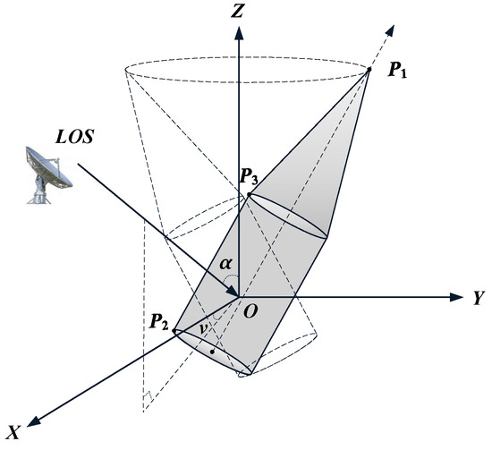 For a precession target, suppose that the coning frequency is , the coning angle is , and its symmetry axis at the initial moment is on the plane. Assume that the target is a smooth, rigid body. Therefore, the effect of the spinning motion on electromagnetic scattering can be neglected due to its rotation symmetry [40]. Considering an arbitrary scattering center p on the cone-shaped target, whose coordinate is , following the similar derivation in [1], the radial distance of scattering center p in the radar LOS direction at time t can be expressed as