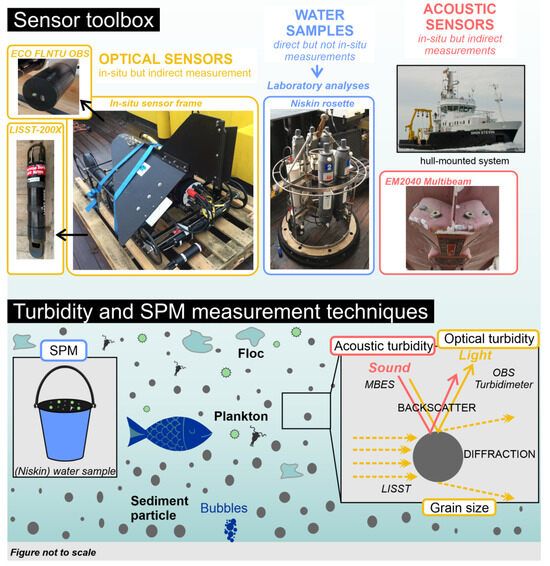 (Top)—the sensor toolbox used within this study comprises optical (LISST-200X, Eco FLNTU OBS) and acoustic (EM2040 MBES hull-mounted on RV Simon Stevin) sensors, as well as (Niskin) water samples. (Bottom)—overview of turbidity and SPM measurement techniques based on different principles: acoustic backscatter (MBES), optical backscatter (OBS), laser diffraction (LISST) and filtration of discrete water samples (Niskin).