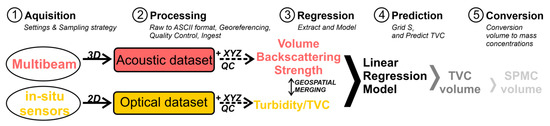We developed a workflow (Figure 5) in which we modeled an empirical relationship between in situ optical turbidity sensor data (TVC in µL/L from the LISST-200X; Turbidity in NTU from the OBS) and acoustic MBES (Sv in dB) data recorded at the same time and location. This modeled relationship was then used to predict SPM in a 3D volume based on acoustic Sv values from the water column.