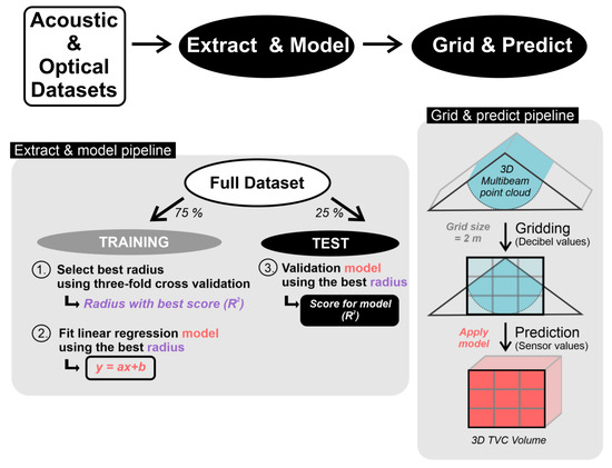 The fitted regression model was then used to predict TVC based on the full 3D acoustic dataset. For this, a 3D grid with resolution of 2 m was created from the 3D MBES point cloud using a simple interpolation algorithm where each point that falls within a radius of 5 m of a raster cell center contributes to the raster value. The radius of 5 m was overall the best radius determined from cross validation. After the evaluation of the goodness-of-fit, the acoustic Sv values for each point of the raster layers was transformed into (Log)TVC volumes using the generated linear regression model (with adj. R2 > 0.4).
