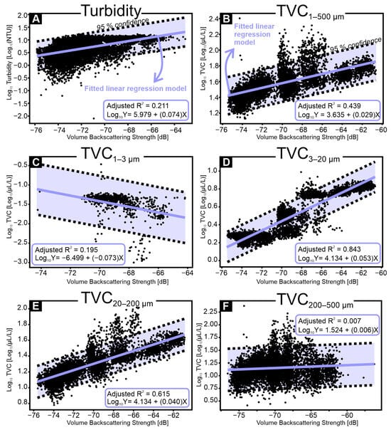 Linear regression models between Sv (in dB), (A) log optical turbidity (in log NTU) and (B–F) different size ranges of log TVC (in log µL/L) (TVC1–500 µm, TVC1–3 µm, TVC3–20 µm, TVC20–200 µm, TVC200–500 µm) using data from multiple campaigns combined.