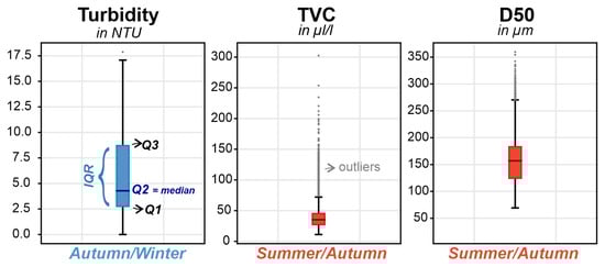 In situ sensor summary box plots of ranges of Turbidity (derived from OBS), Total Volume concentration, and D50 (derived from LISST), averaged over all depths. OBS measurements were only available for the “autumn/winter” months (October 2020, February 2021, March 2021), while LISST measurements were only retained for the “summer/autumn” (October 2020, May 2021, July 2021) months. Box plots parameters: outliers, Q1−1.5 × IQR, Q1 25%, Q2 50%, Q3 75%, Q3 + 1.5 × IQR, outliers.