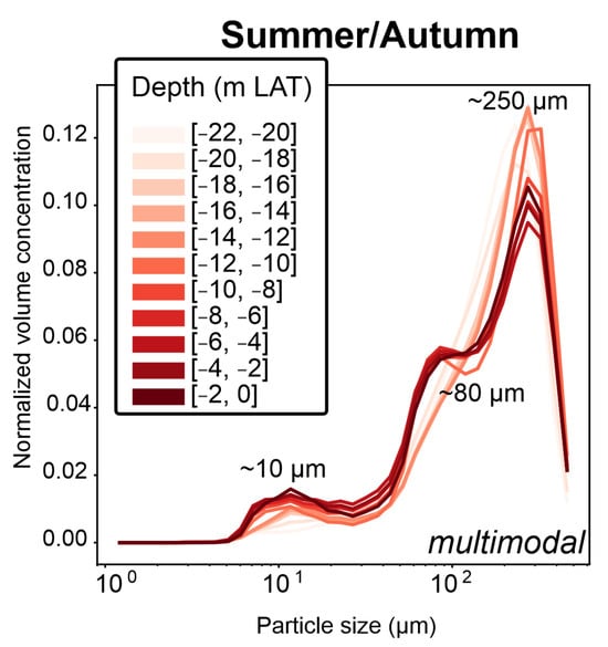 PSD plots (derived from the LISST-200X), binned every 2 m, for the “summer/autumn” (October 2020, May 2021, July 2021) dataset. The volume concentration is normalized by dividing the values with the total volume concentration.