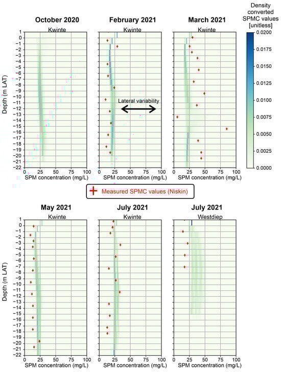 The converted mean SPMC volumes of each campaign can be consulted in Zenodo [99]. Investigation of these plots reveals clear spatiotemporal variability in the BPNS. For example, during the March 2021 campaign, we detected a remarkable layer with high Sv and SPMC values in the water column at −14 m LAT around noon (Figure 9). Eventually, this layer slowly descended and eventually disappeared around 2 pm. The spatiotemporal aspect of this feature was captured by the 3D SPM grid. The reason why the layer is not “visible” in the eastern part of grid is because we surveyed from West to East, so the layer was already gone when we surveyed the eastern part of the survey area. This phenomenon is discussed in more detail in Section 6.4.