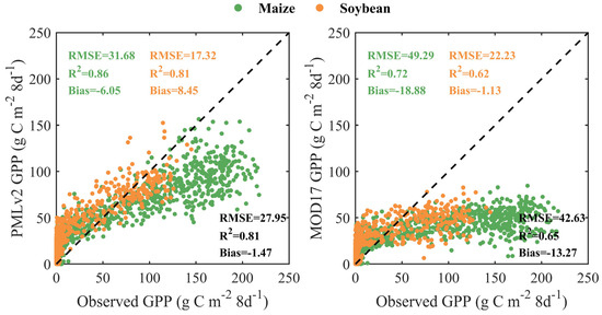 Scatter plots of the eight-day observed GPP and RS-based GPP from the PMLv2 and MOD17 products for C4 maize and C3 soybean at the five cropland sites. The statistical metrics with green, orange, and black colors represent the performance of the PMLv2 and MOD17 products for maize, soybean, and both species, respectively.