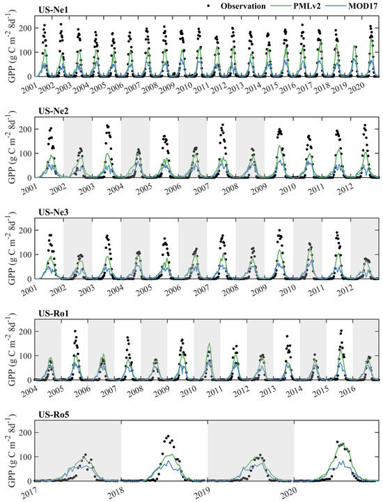 Time series of the eight-day observed GPP and RS-based GPP from the PMLv2 and MOD16 products at the five cropland sites. The years with white backgrounds represent that C4 maize was planted this year. The years with grey backgrounds represent that C3 soybean was planted this year.