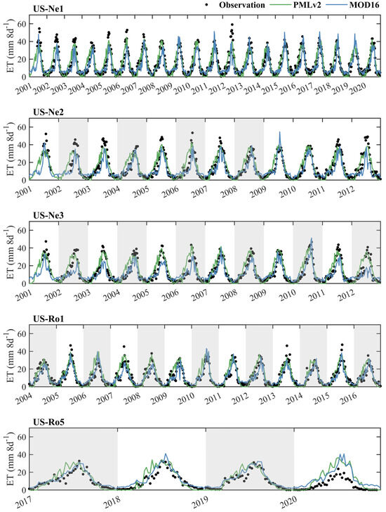 Time series of the eight-day observed ET and RS-based ET from the PMLv2 and MOD16 products at the five cropland sites. The years with white backgrounds represent that C4 maize was planted this year. The years with grey backgrounds represent that C3 soybean was planted this year.