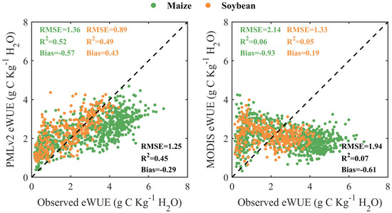 The PMLv2 product has been proven to outperform the MODIS product in eight-day eWUE estimations for both C4 maize and C3 soybean (see Figure 6). The MODIS product commonly exhibited noticeable overestimations and underestimations under low and high observed eWUE for both maize and soybean, respectively. During the peak of growing seasons (characterized by high observed eWUE), both the MOD17 and MOD16 products underestimated observed GPP and ET, respectively; however, the degree of underestimations of the observed GPP was larger than that of the observed ET. Therefore, the eWUE calculated from the MODIS product was still lower than the observed eWUE. During the start and end of growing seasons (characterized by low observed eWUE), the MOD17 and MOD16 products overestimated and underestimated observed GPP and ET, respectively, thus leading to the overestimations of observed eWUE. By contrast, the PMLv2 product achieved significantly more satisfactory performance in eWUE estimations and only slightly underestimated the observed eWUE during the peak of growing seasons for maize and slightly overestimated the observed eWUE during the start and end of growing seasons for both maize and soybean. The underestimations of observed eWUE for maize mainly stem from the underestimation of GPP from the PMLv2 product, which has been discussed above. The slight overestimations of observed eWUE for soybean can be explained by that the overestimations of GPP were more pronounced than that of ET and the small value of ET.