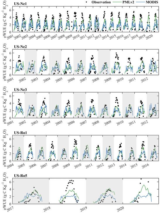Time series of the eight-day observed eWUE and RS-based eWUE from the PMLv2 and MODIS products at the five cropland sites. The PMLv2 eWUE was calculated as the ratio of GPP and ET from the PMLv2 product. The MODIS eWUE was calculated as the ratio of GPP from the MOD17 product and ET from the MOD16 product. The years with white backgrounds represent that C4 maize was planted this year. The years with grey backgrounds represent that C3 soybean was planted this year.