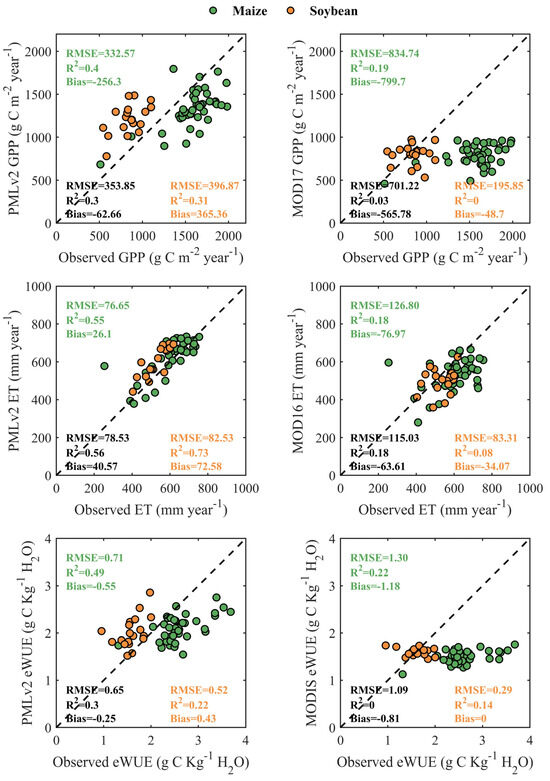Figure 8 shows the comparison of the annual observed GPP, ET, and eWUE and RS-based GPP, ET, and eWUE from the PMLv2 and MODIS products for C4 maize and C3 soybean at the five cropland sites. Overall, the PMLv2 annual GPP, ET, and eWUE performed better than the MODIS annual GPP, ET, and eWUE with lower Bias and RMSE, and higher R2. For GPP and ET estimations, the PMLv2 product with a Bias of −256.3 g C m−2 year−1 and 26.1 mm year−1 and an RMSE of 332.57 g C m−2 year−1 and 76.65 mm year−1 for maize performed better than that with a Bias of 365.36 g C m−2 year−1 and 72.58 mm year−1 and an RMSE of 396.87 g C m−2 year−1 and 82.53 mm year−1 for soybean, respectively. For eWUE estimations, the PMLv2 product for soybean with a Bias of 0.43 g C Kg−1 H2O and an RMSE of 0.52 g C Kg−1 H2O outperformed that for maize with a Bias of −0.55 g C Kg−1 H2O and an RMSE of 0.71 g C Kg−1 H2O. However, the MODIS product for soybean produced better estimates than that for maize for all the GPP, ET, and eWUE at an annual scale, as indicated by the RMSE and Bias reducing from 834.74 g C m−2 year−1 and −799.7 g C m−2 year−1, 126.80 mm year−1 and −76.97 mm year−1, 1.30 g C Kg−1 H2O and −1.18 g C Kg−1 H2O for soybean to 195.85 g C m−2 year−1 and −48.7 g C m−2 year−1, 83.31 mm year−1 and −34.07 mm year−1, 0.29 g C Kg−1 H2O and 0 g C Kg−1 H2O for maize, respectively.