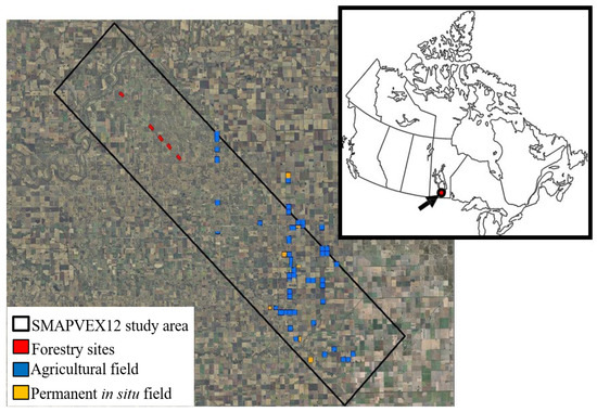 SMAPVEX12 study area and locations of ground surface measurement points (https://smapvex12.espaceweb.usherbrooke.ca/, accessed on 7 October 2023).