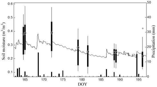 Temporal profiles of volumetric soil moisture (mv) measured by portable probes (box-and-whisker plots; circles superimposed on the boxes are means), daily mean soil moisture recorded by the automated stations (solid line), and mean precipitation (accumulated over 6 h intervals) measured by the meteorological stations above the wheat fields (bar chart).