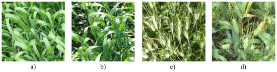Photos of wheat plants at different growth stages: (a) stem elongation at day 170; (b) appearance of spike in sheath and end of stem elongation at day 176; (c) heading at day 189; (d) ripening at day 198 (https://smapvex12.espaceweb.usherbrooke.ca/, accessed on 7 October 2023).