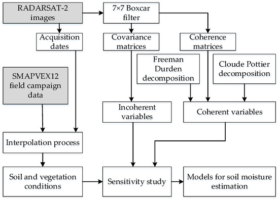 The approach used in this study was (1) to determine the most sensitive non-polarimetric and polarimetric variables and (2) to develop statistical models for estimating soil moisture in wheat fields over the growing season. The various steps in the methodological approach are summarized in Figure 4.