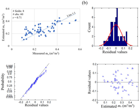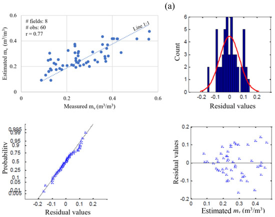 The first model that was developed is based upon multiple regression that considers all six non-polarimetric and polarimetric variables, which were selected during the sensitivity analysis (Section 3.2). This model is referred to as a mixed polarimetric model or MixPol in the text. All βi coefficients obtained for the MixPol model are significant (p < 0.05), as indicated in Table 6. Its RMSE error (0.078 m3/m3) is lower than that of Sigma_Hv and, likewise, its correlation is higher (r = 0.77 vs. r = 0.60). The histogram of residuals and the normal probability plot, together with observed homoscedasticity in the distribution of residuals (vs. predicted mv), indict that MixPol is well conditioned (Figure 6a).