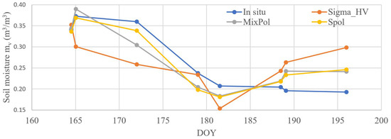 Most of non-polarimetric and polarimetric variables are sensitive to growth stages. For example, variables ϕHH−VV in MixPol and Spol models depend greatly on scattering mechanisms between the underlying soil and wheat canopy, which has vertical stalks. At the beginning of the field campaign bare soil was dominant. However, as the plant grows, the co-polarized backscattering tends to augment due to the combination of surface and dihedral scattering, while the cross-polarized backscattering tends to increase with vegetation volume scattering. These dynamics can influence the models’ behaviors. By examining the temporal profiles of estimated values of mv (Figure 8), a negative residual bias can be observed for all models, from the start of the campaign to the stage of grain development, after which the bias then becomes positive. This complex response could be explained by estimates of calibration coefficients βi that were associated with backscattering, which were too low at the start of the campaign, and too high at the end of the campaign (vegetation effects). A potential improvement would be to identify a polarimetric variable that could weight backscattering effects by phenological stage.